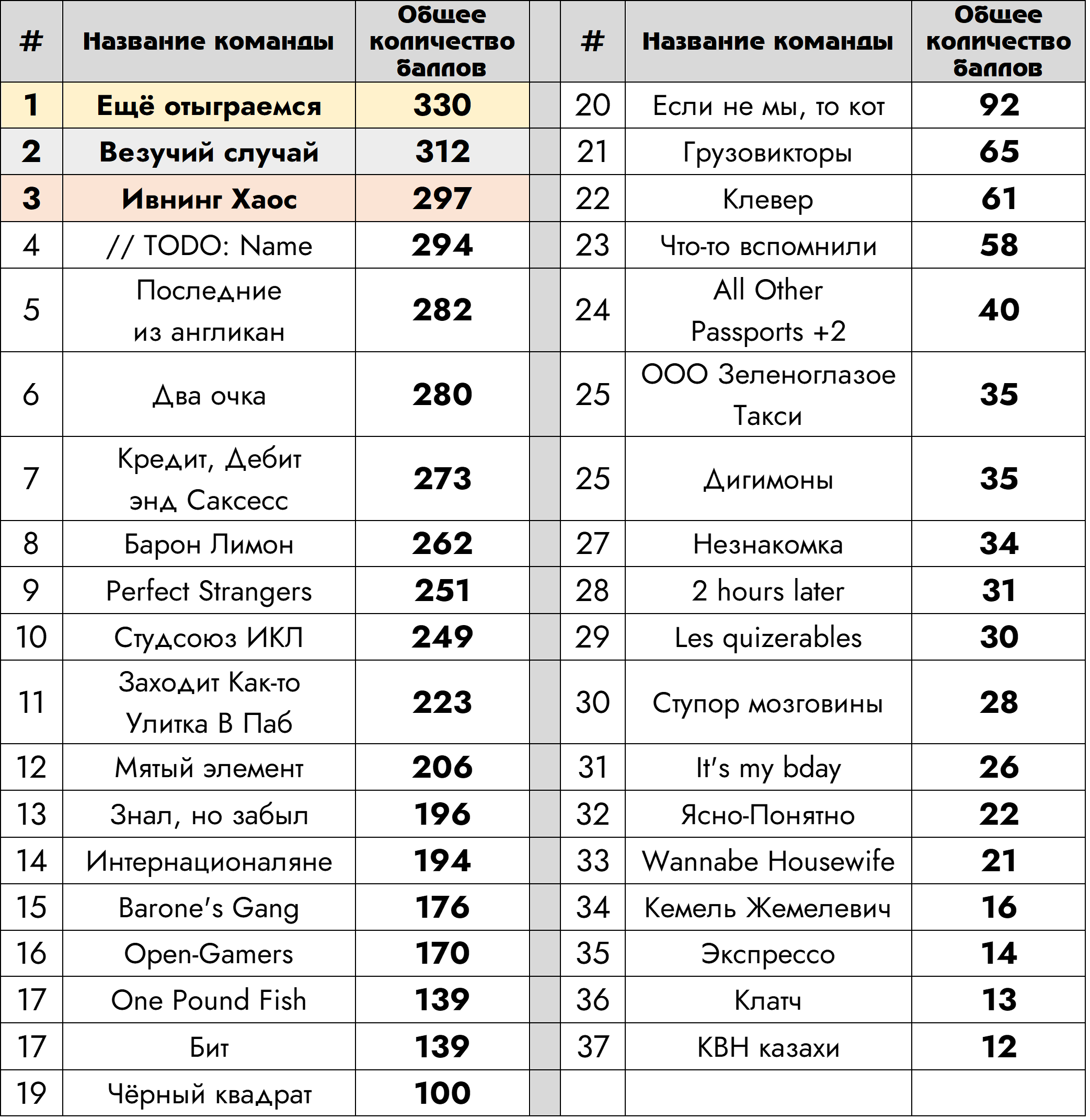 Каждая команда, сыгравшая хотя бы в одном нашем квизе, автоматически попадает в командный зачёт. Это общая турнирная таблица, показывающая баллы, набранные командой за все игры, в которых она принимала участие.